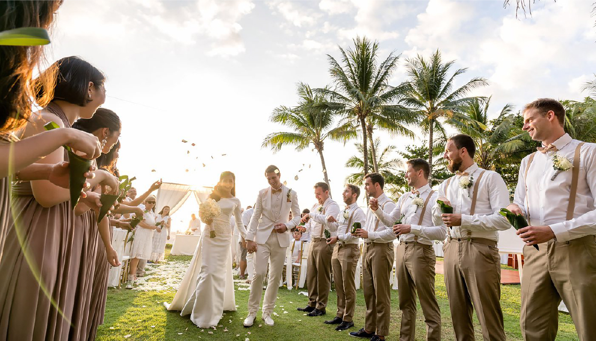 Alternatively, celebrate your special day with a Thai ceremony. The groom will be accompanied by a long drum procession on his way to meet his bride. Once together, the couple has the good fortune of being blessed by Buddhist monks. The ceremony ends with a traditional water pouring ritual from family and wedding guests.